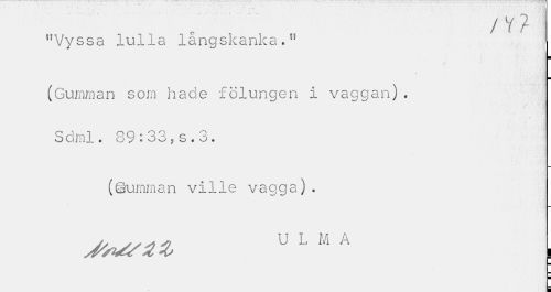 //// in //// "Vyssa lulla langskanka." //// (Gumman som hade fölungen i vaggan). //// Sdml. 89:33,s.3. //// (Summan ville vagga). //// JM** u L M A , //// ¦ //// i ////
