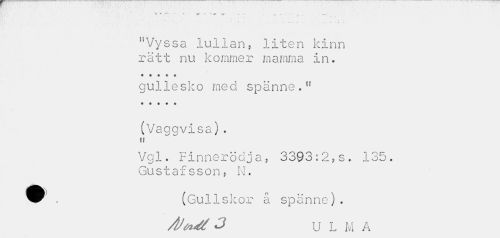 //// % * T- r -T* V v '¦- •• • , -- //// uVyssa lullan, liten kinn rätt nu kommer mamma in. • « • » t //// gullesko med spänne." //// (Vaggvisa). tt //// Vgl. Finnerödja, 3393:2,s. 135. Gustafsson, M. //// . (Guliskor å spänne). //// AJfrJt 3 U L M A ////