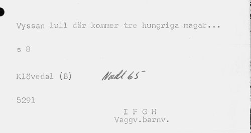 //// Vyssan lull elär kommer tre hungriga magar... s 8 //// Klövedal (B) /ffafr //// i //// ¦ 5291 i //// I F G H //// Vaggv.barnv. //// i ////