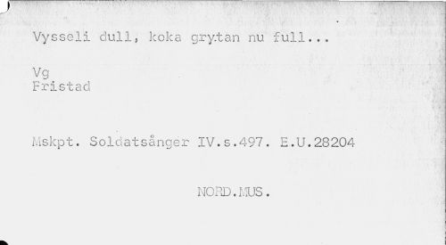 //// • i > i . > //// •. ¦ . • • i , • *. , . -. , //// Vysseli dull5 koka grytan nu full... //// Vg //// Fristad //// Mskpt. Soldatsånger IV.s.497. E.U.28204 //// NORD.MUS. ////