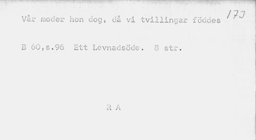 //// /7J //// Vår moder hon dog, då vi tvillingar föddes B 60.s.96 Ett Levnadsöde. 8 str. //// p a //// xi /\ ////