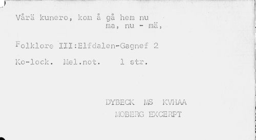 //// [f' //// Vara kuneroj kom å gå hem nu I //// ma , nu - rnä , j. //// folklore III:Elfdalen-Gagnef 2 Ko-lock. Mel.not. 1 str. //// DYBECK MS KVHAA iåCBERG EXCERPT ////