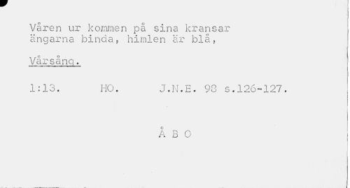 //// Våren ur kommen på sina kransar ängarna binda, himlen är blå, //// Vårsång. //// 1:13. HO. J.N.E. 93 s.126-127. //// I //// ÅBO ////