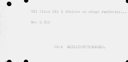 //// Väl finns här i världen en mängd rariteter... Se: G 216 //// KB:s SKILLINGTRYCKS REG. //// i ML ////
