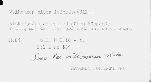 //// Välkommen sista lefnaosqväll... //// Afskedssång af en med döden kämpande fattig man till sin gråtande hustru o. barn. //// H.Bj. G.K. W.8.10 - s. //// Del 1 nr 569 //// Jl»tö i^^r^t^ I //// RANCKEN FÖRTECKNING //// ... ////