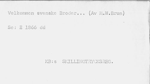//// Ve1kommen svenske Broder.*. (Av M.W.Brun) ] //// fl //// Se: E 1866 dd //// * //// KB:s SKILLINGTRYCKS REG. //// I ////