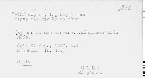 //// •V //// ; J/Ö //// "Vänd dig om, tag mig i faran dansa med mig än en gång." //// (Ej be skr. men hänvisn.t.Sånglekar från Xniaas . ) //// Ögl. St.Anna, 1207, s.44 Stenbock (h. 4:o) //// D 119 I //// "" U L M A | //// Sånglekar 1 ////