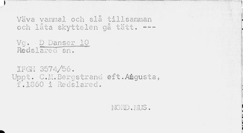 //// Väva vamma! och slå tillsamman och låta skyttelen gå tätt.--- //// Va. ¦ D Danser 10 Redsiared sn. //// IFGli 3574/56. Uppt. C.M.Bergstrand eft.Amgusta5 //// f.1860 i Reds1ared. //// NORD.HUS. j ////