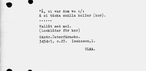 //// !,A, si var dom va :/: å si tåcka snälla kullur (kor). //// Vallåt med mel. (Locklåtar för kor) //// Gästr.österfärnebo. //// 3454:5, s.27» Isaksson,!. //// ULMA. ////