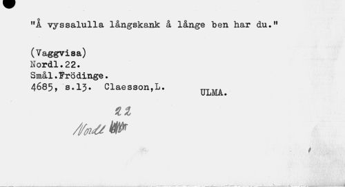 //// "Å vyssalulla långskank å långe ben har du." //// (Vaggvisa) //// Nordl.22. //// Smål.Frödinge. //// 4685, s.13. Claesson,L. //// 7 ULMA. //// 4.1 //// /fo/tHP //// * //// v i ////