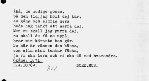 //// Åhå, du modige gosse, //// på den tid,jag höll dej kär, j //// en gång och aldrig mera //// hade jag tänkt att narra dej, //// Men nu skall jag purra dej, j //// nu skall du få se uppå, //// hvar min käraste han går. //// Se här är vännen den bästa, //// som alla mina tankar fästa, //// ja vi ska leva och vi ska dö med hvarandra. //// Skåne. D.71* //// H.Å.10769- NORD.MUS. ////