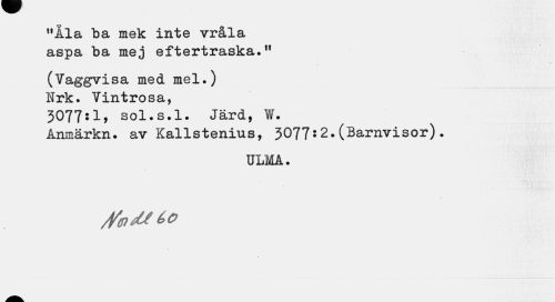 //// "Åla ba mek inte vråla //// aspa ba mej eftertraska.11 //// ¦ //// (Vaggvisa med mel.) //// Nrk. Vintrosa, //// 3077:1, sol.s.l. Järd, W. //// Anmärkn. av Kallstenius, 3077•2.(Barnvisor). //// ULMA. //// /Vtpdféa ////