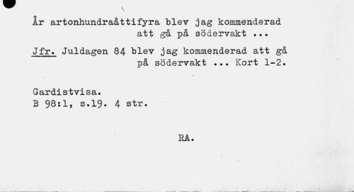 //// ir artonhundraåttifyra "blev jag kommenderad //// att gå på södervakt ... //// Jfr. Juldagen 84 blev jag kommenderad att gå //// på södervakt ... Kort 1-2. //// « //// Gardistvisa. B 98:1, s.19. 4 str. //// HA. ////