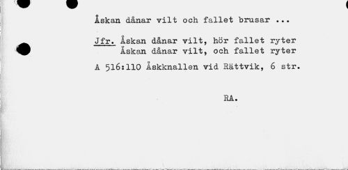 //// Askan dånar vilt och fallet brusar ... //// ^^ Jfr. Åskan dånar vilt, hör fallet ryter //// Åskan dånar vilt, och fallet ryter //// A 516:110 Åskknallen vid Rättvik, 6 str. //// RA. ////