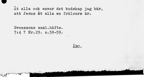 //// At alla ock envar det "budskap jag "bär, att Jesus åt alla en frälsare är. //// Svenssons saml.häfte. //// 7:4 ? Ur.29- s.58-59- //// r- t //// ÅBO. //// \ //// x V» •«- J ////