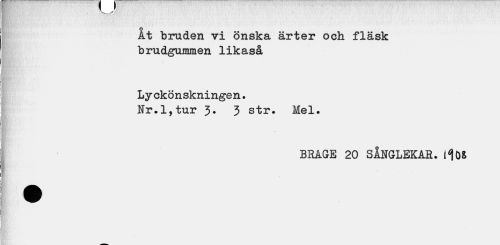 //// Åt //// bruden vi önska ärter och fläsk brudgummen likaså //// Lyckönskningen. //// Nr.1,tur 3. 3 str. Mel. //// BRAGE 20 SÅNGLEKAR. l^ÖS ////