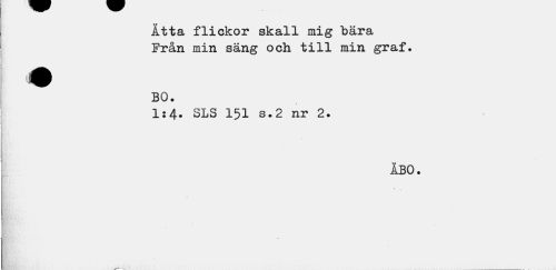 //// Åtta flickor skall mig bära Från min säng och till min graf. //// « //// BO. //// 1:4. SLS 151 s.2 nr 2. //// ÅBO. ////