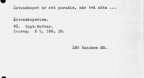 //// Äktenskapet är ett paradis, när två såta ... //// i i //// i //// Äktenskapsvisa. //// VÖ. Upp t. V/e f var. 5:oreg. R 5, 186, 28. //// « //// ÄBO Rancken MS. ////