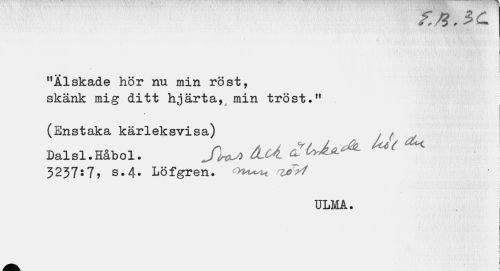 //// f //// i //// "Älskade hör nu min röst, //// skänk mig ditt hjärta, min tröst //// « //// (Enstaka kärleksvisa) Dalsl.Håbol. //// ju* kol M ** //// 3237:7, s.4. Löfgren. rzfyf //// ULMA. //// j //// i //// j //// _ \ ////