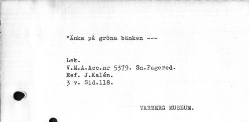 //// "Anka på gröna bänken --- //// Lek. //// V.M.A.Aec.nr 5379* Sn.Fagered. Ref. J.Kalén. 3 v. Sid.118. //// VABBERG MUSEUM. ////