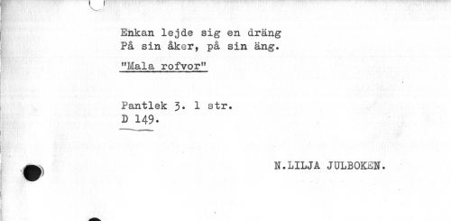 //// __ //// ¦ //// Enkan lejde sig en dräng På sin åker, på sin äng. //// "Mala rofvor" //// » //// Pantlek 3. 1 str. //// D 149. //// ^ N. LILJA JULBOKiSN. //// I ////