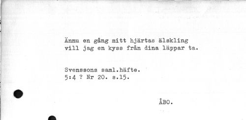 //// Ännu en gång mitt hjärtas älskling vill jag en kyss från dina läppar ta. //// Svenssons saml.häfte. //// 5:4 ? Nr 20. s.15. //// ÅBO. //// T ////