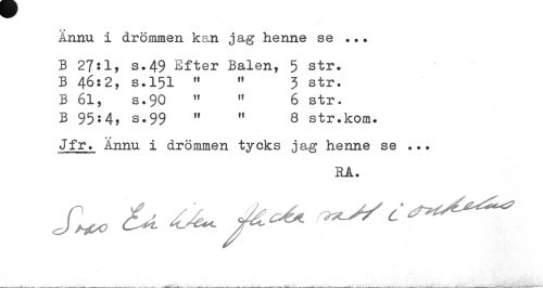 //// + « //// Ännu i drömmen kan jag henne se ... //// B 27:1, s.49 Efter Balen, 5 str. B 46:2, s.151 " " 3 str. B 61, s.90 " " 6 str. //// B 95:4, s.99 « " 8 str.kom. //// , » * //// i drömmen tycks jag henne se ... //// RA. //// J'^ <U ^ jtt** r^/C ^^ ////