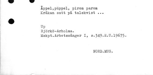 //// Appel,päppel, pirom parom Kråkan satt på talekvist //// ^ Up //// Björkö-Arholma. //// Mskpt.Arbetssånger I, s.349«£»U.19675• //// NORD.MUS» ////