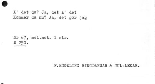 //// I //// Äf det du? Ja, det ä1 det Kommer du nu? Ja, det gör jag //// i //// Nr 67, mel.not. 1 str. D 250. //// l //// F.EGGELING RINGDANSAR & JUL-LEKAR. //// i I ////