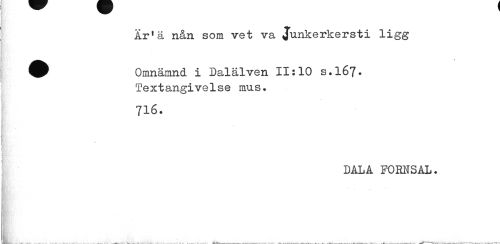 //// År1ä nån som vet va Junkerkersti ligg //// Omnämnd i Dalälven 11:10 s.l67» //// Textangivelse mus. 716. //// DALA FORNSAL. //// ¦Ki-; -''' i it //// ¦ ////