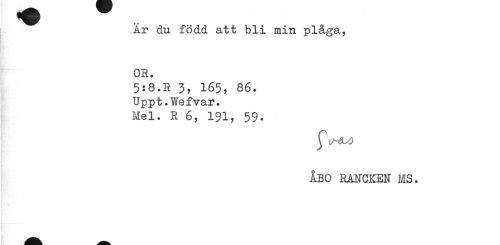 //// Är du född att bli min plåga, OR. //// 5:8.r 3, 165, 86. //// Uppt.Wefvar. Mel. R 6, 191, 59. //// ÅBO RÅNCKEN MS. ////