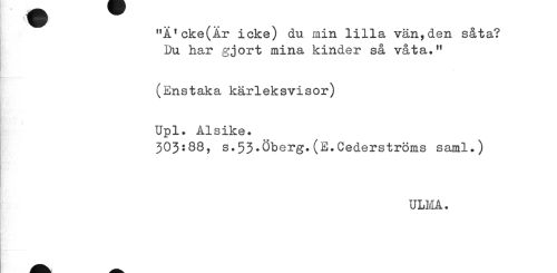 //// ,lÄ,cke(Är icke) du min lilla vän,den såta? Du har gjort mina kinder så våta.11 //// (Enstaka kärleksvisor) Upl. Ålsike. //// 303:88, s.53.Öberg.(E.Cederströms saml.) //// ULMÅ. ////