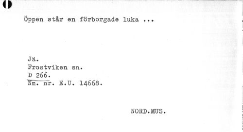 //// "Öppen står den förborgade lucka." //// p //// ja. //// Frostviken sn. D 266. //// 1m. nr. E.U. 14668. //// NOBD.MUS. //// I //// ! //// I //// I //// I ////