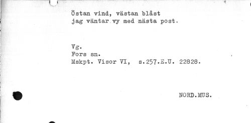 //// gr . //// Östan vind, västan blåst jag väntar.vy med nästa post. //// Vg. //// Pors sn. //// Mskpt. Visor VI, s.257-2.U. 22828. tik NORD.MUS. ////