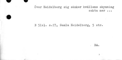 //// Över Heidelberg sig sänker kvällens skymning //// sakta ner ... //// B 51:1. s.27* Gamla Heidelberg, 5 str. //// ¦ RÅ. //// f .. ////