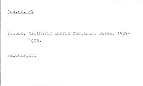 //// Aec.nr. 47 //// Visbok, tillhörig Ingrid Carlsson, Borås, 1907-1908. //// vaxdukspärm ////