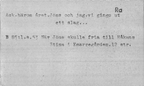//// Ra //// Ack,härom året,Jöns och lag»vi gingo ut //// ett slag... //// B 85 il.a.53 ^r Jöns- skulle fria till Håkans //// "tina Knarregården. 12 str. ////