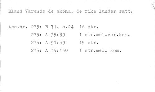 //// s //// Bland Värends de sköna, de rika lunder satt. //// Acc.nr. 275: B 71, s.24 16 str. //// 275: A 35:39 1 str.mel.var.kom. //// 275: A 91 :59 15 str. //// 275: A 35:130 1 str.mel. kom. ////