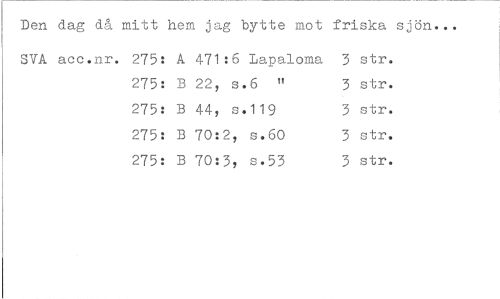 //// Den dag då mitt hem jag bytte mot friska sjön... //// SVA acc.nr. 275: A 471:6 Lapaloma 3 str. //// 275: B 22, s.6 " 3 str. //// 275: B 44, s. 119 3 str. //// 275: B 70:2, s.60 3 str. //// 275: B 70:3, s.53 3 str. ////