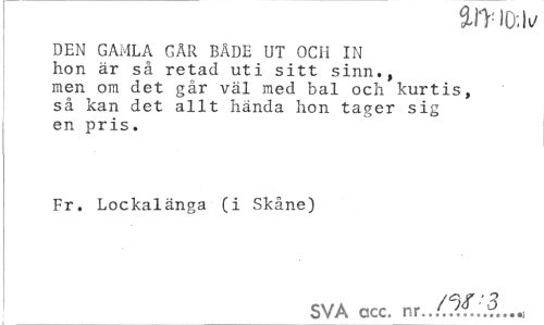 //// DEN GAMLA GÅR BÅDE UT OCil IN hon är så retad uti sitt sinn., men om det går väl med bal och kurtis, så kan det allt hända hon tager sig en pris. //// Fr. Lockalänga (i Skåne) //// SVA cscc. nr...Ö.f. ////