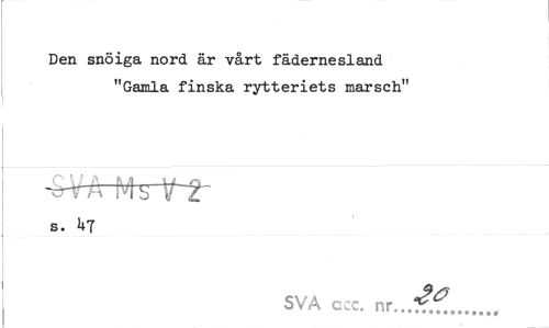 //// Den snöiga nord är vårt fädernesland //// "Gamla finska rytteriets marsch" //// -S-VA Ms V fr //// s. kr //// SVA ccc. ... ////