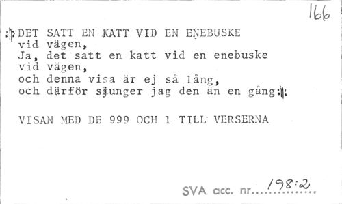 //// llop //// ;|DET SATT EN KATT VID EN ENEBUSKE vid vägen, //// Ja, det satt en katt vid en enebuske vid vägen, //// och denna visa är ej så läng, //// och därför sjunger jag den än en gång;'||i //// VISAN MED DE 999 OCH 1 TILL VERSERNA //// SVA gcc. nr.../.?.?.'!?:. ////