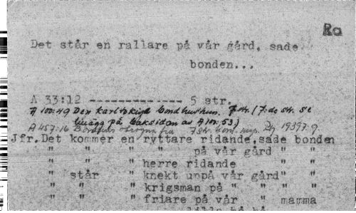 //// ta //// 1 Det står en rallare på vår gård» sade //// bonden. //// I A ^3:12---5 str. //// n fiHyyit yjffi^^teyh. fy W7?"} //// a Jfr. Det kommer en Ryttare ridande, sade bondm //// - »• " » * på v*r gård " //// | " " '' herre ridande //// 1 " 'står " knekt a^på vår /rård" H . //// " " krigsman på " * " //// " " friare på vår " rrar-nia //// f • -t • «» • .. .»•..• ////