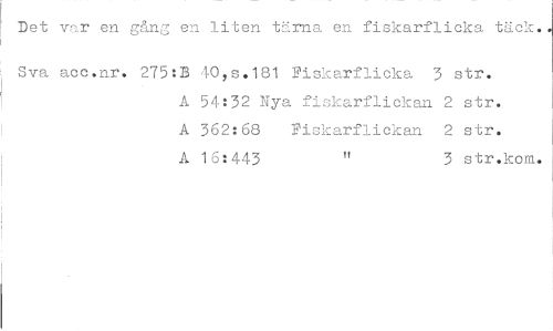 //// Det var en gång en. liten tärna en fiskarflicka täck. //// Sva acc.nr. 275:33 40,s.181 Fiskarflicka 3 str. //// A 54:32 Nya fiskarflickan 2 str. A 362:68 Fiskarflickan 2 str. A 16:443 " 3 str.kom. ////