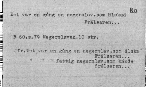 //// Eo //// Det var en gång en negerslav,som älskad 1 ' Frälsaren... //// B 60,s.79 Negerslaven.10 str. //// | //// g Jfr.Det var en gång en negerslav,som älska' = Frälsaren... //// | " " fattig negerslav,som kände //// : frälsaren... ////