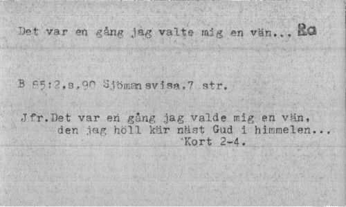 //// Det var en gång jag valte mig en vän.., Rd //// B s'5t2,s»9C Sjöman svi sa,7 str. //// Jfr.Det var eri gång jag valde mig en vän, //// den jag höll kär näst Gud i hirnmelen.. . //// Kort 2-4. ////