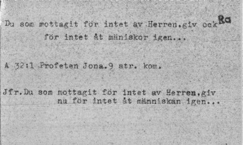 //// ört //// Du som mottagit för intet av Herren.giv ock1* för intet åt mäniskor igen... //// A 32:1 Profeten Jona.9 str. kom. //// Jfr.Du som mottagit för intet av Herren,giv nu för intet åt människan igen... ////
