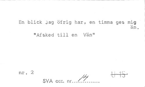 //// En blick jag öfrig har, en timma ges mig //// än. //// "Afsked till en Vän" //// nr- 2 al, -bMtr //// SVA ccc. nr... ////