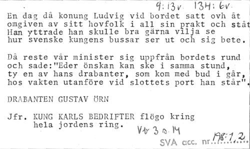 //// i• lo v- 1 on • En dag då konung Ludvig vid bordet satt ovh åt omgiven av sitt hovfolk i all sin prakt och stå" Han yttrade han skulle bra gärna vilja se hur svenske kungens bussar ser ut och sig bete. //// Då reste vår minister sig uppfrån bordets rund och sade:"Eder önskan kan ske i samma stund, ty en av hans drabanter, som kom med bud i går, hos vakten utanföre vid slottets port han står": //// DRABANTEN GUSTAV ÖRN //// Jfr. KUNG KARLS BEDRIFTER flögo kring hela jordens ring. _ .. //// ar i o SVA ccc. nr.(?r..w.^« ////