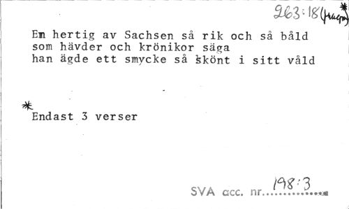 //// Em hertig av Sachsen så rik och så båld //// som hävder och krönikor säga //// han ägde ett smycke så kkönt i sitt våld //// Endast 3 verser //// W 3 //// SVA gcc. nr... ////